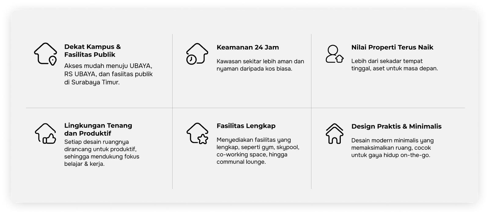 Hunian minimalis dengan desain estetik, fasilitas super lengkap, dan akses 2 menit ke UBAYA. Pilihan Cerdas Generasi Produktif!